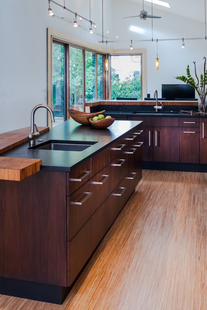 Below a modern light-filled kitchen in the DC metro area features Cambrian Black Granite with honed finish complimenting the dark stained frameless cabinets.