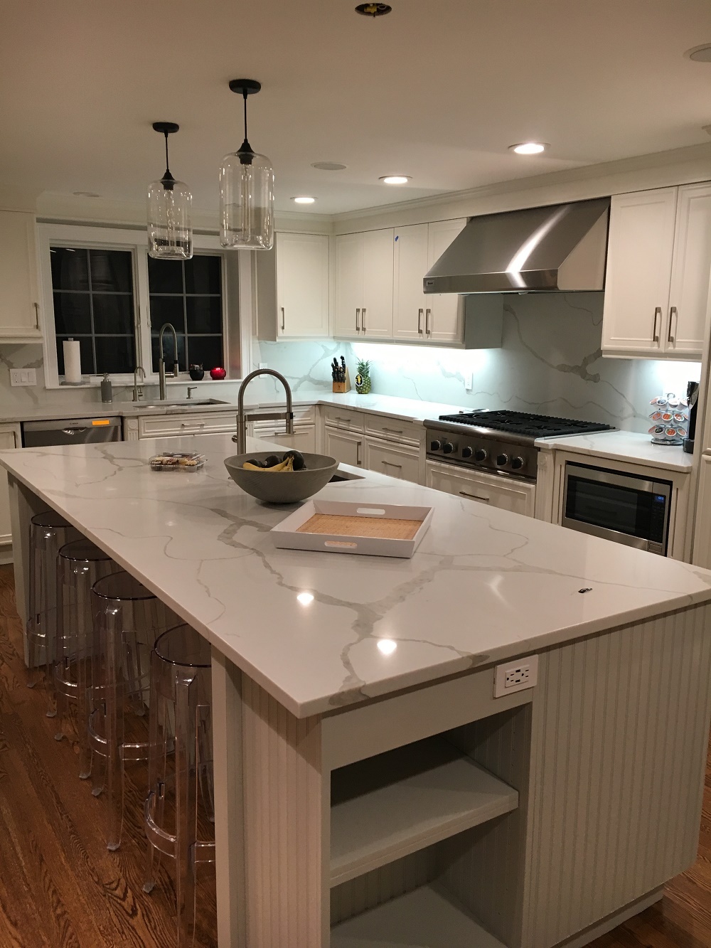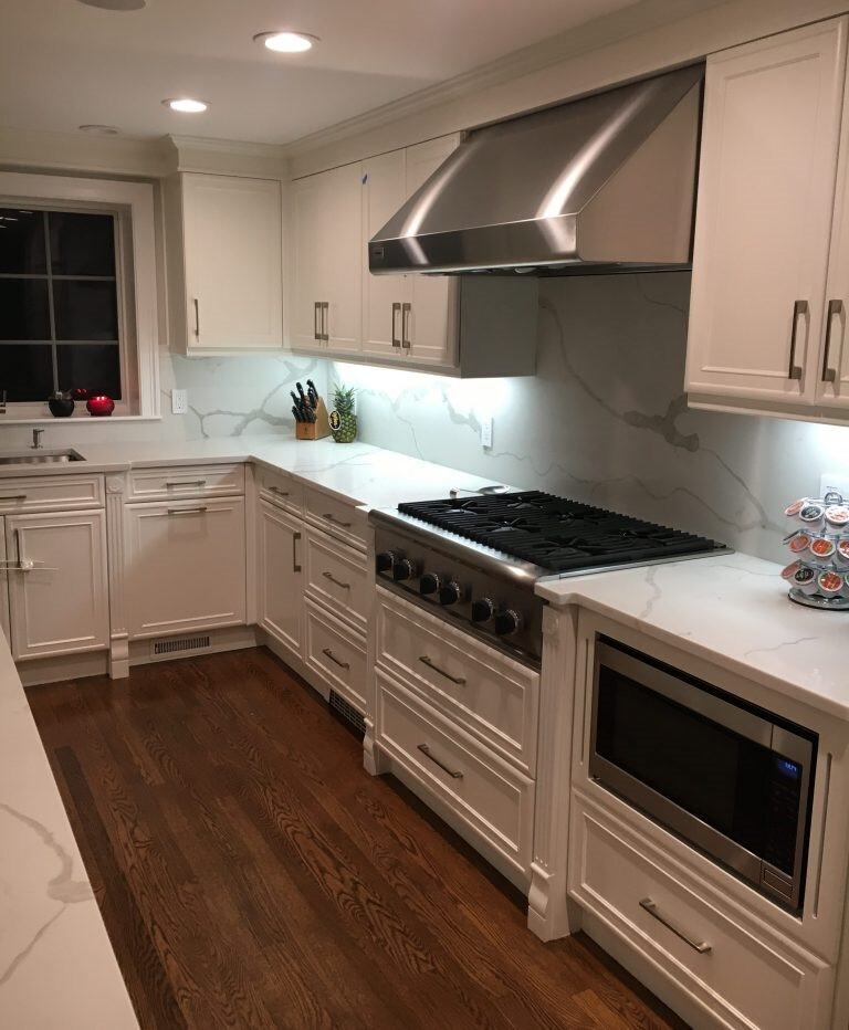 Here is a beautiful example of white on white. This recent remodel by Metropolitan Cabinets & Countertops, our colleagues just down the street from us here at Marble & Granite, Inc.