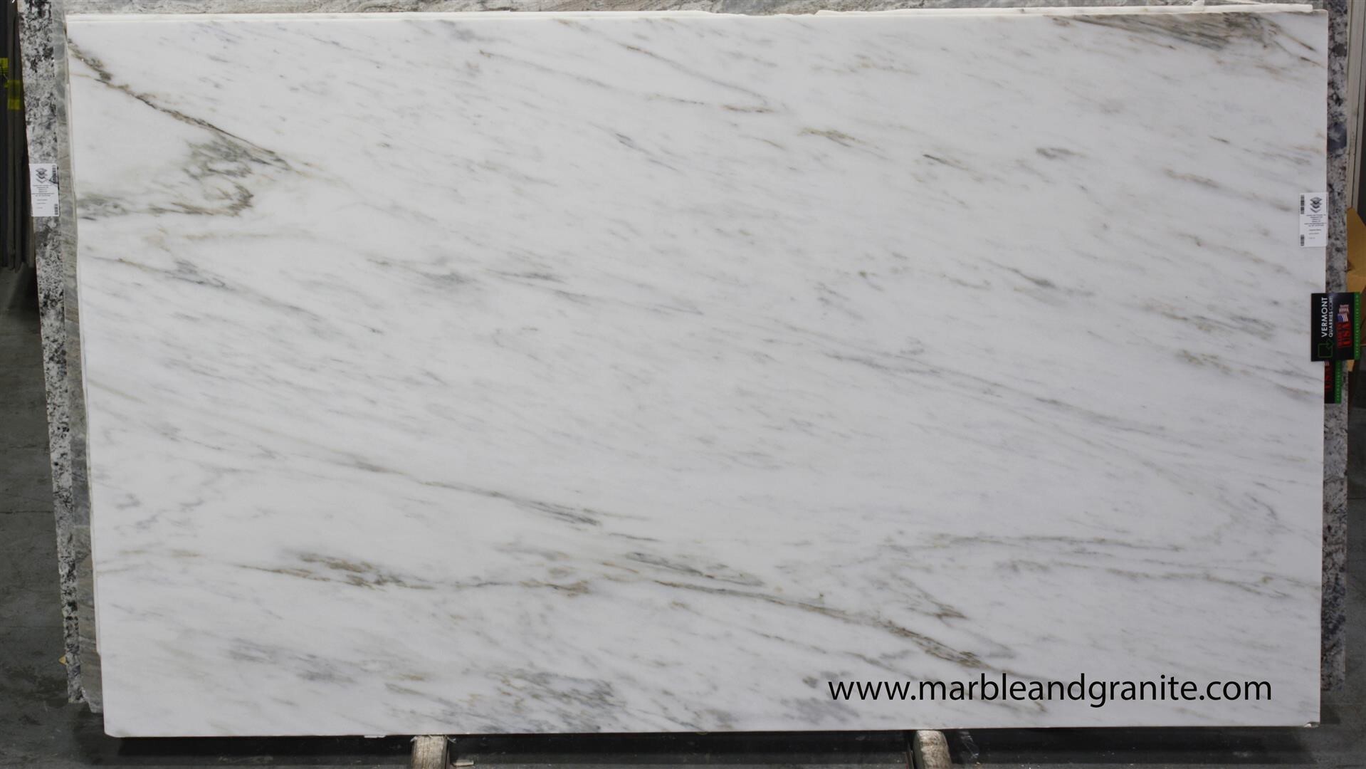Most of the material on the side of the quarry is Eureka Danby. It’s darker gold with medium to heavy gray veins, and it’s often compared to Calacatta Gold. When the material has less gold veining, it’s classified as Imperial.
