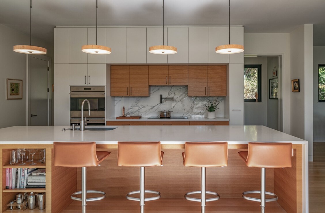 This “net-zero” home in Hingham, Ma. features Vega White countertops from Santa Margherita Quartz. Photo courtesy of Eric Roth.