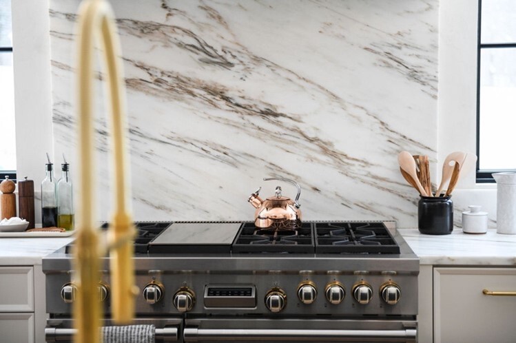 Often compared to Italy’s Calacatta Gold in looks, Eureka Danby is every bit as stunning as Imperial Danby. Eureka’s veining is a bit stronger and often on the darker gold side, which makes it a beautiful choice to complement gold decorative and functional hardware like the those that Freeman incorporated into her kitchen design.