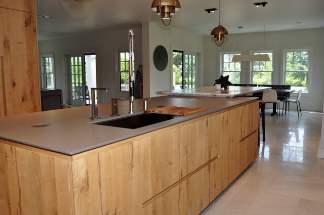 Designed by Jill Vieth of White Hart Design on Nantucket, this kitchen recently won the Builders and Remodelers Association of Greater Boston’s Gold PRISM Award, which recognizes the finest projects and outstanding achievements in the home building industry. The kitchen beautifully blends manmade materials with those made by Mother Nature. Here, Vieth mixed Neolith surfacing with gorgeous natural stone—both supplied by Marble & Granite, Inc. Neolith in Concrete serves as countertops while a full-height backsplash of Royal Danby Marble covers perimeter walls. The result is an eye-catching space that’s clean and modern as well as warm and welcoming.