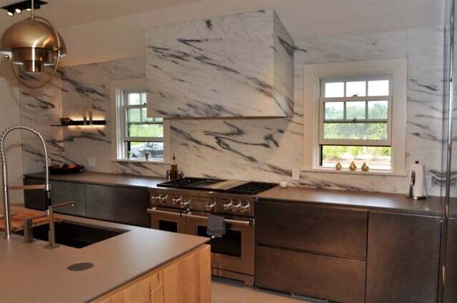 Adding a bit of contrast, Royal Danby Marble covers the backsplash. By taking the backsplash to the ceiling and also covering the range hood, Vieth created visual texture with the darkly veined marble, creating a sense of modern luxury.