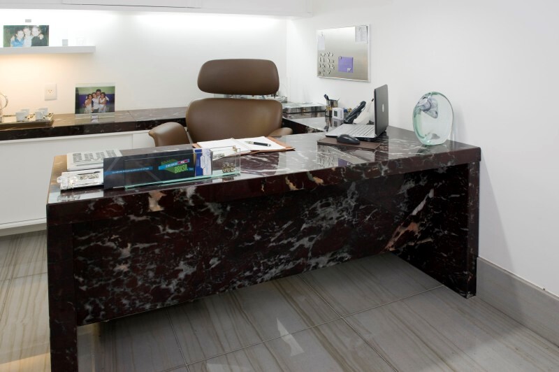 Or Rosso Fiorentino Quartzite can serve as a functional piece of modern sculpture as it does in this contemporary office.