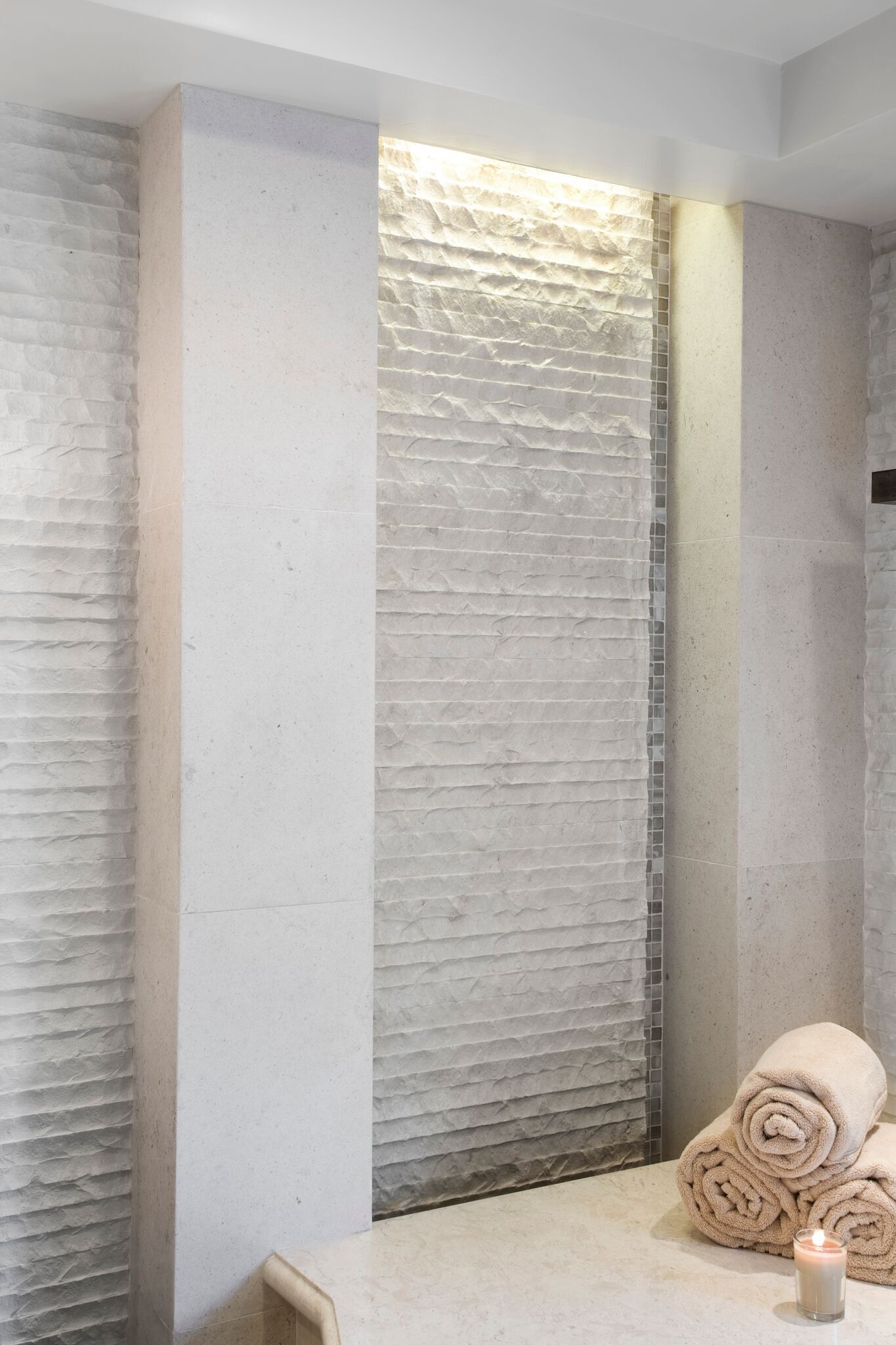 Here are a few examples of statement-making natural stone accent walls in the bath: