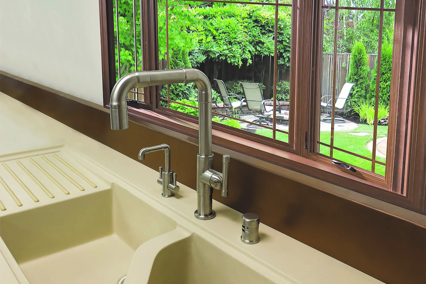 Whether the setting is an urban loft, a country villa, or anything in between, the rustic/industrial look is a hot trend right now. With the rustic/industrial look as their signature style, Sonoma Forge offers Made in America kitchen and bath faucets with the look of hand-forged metal. The Brut series is reminiscent of raw plumbing parts. The tall tap with elbow spout makes a strong design statement, and the pull-down spout offers the sink area functionality that’s required.
