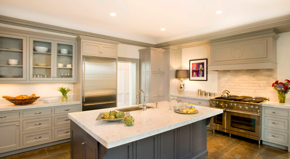 Threshold Interiors combined gray cabinets with elegant Fantasy Brown Quartzite.